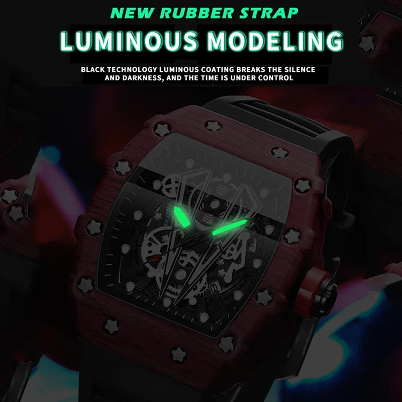 BINBOND B8577 Men’s Barrel Sports Watch – Hollow Curved Mirror Silicone Quartz